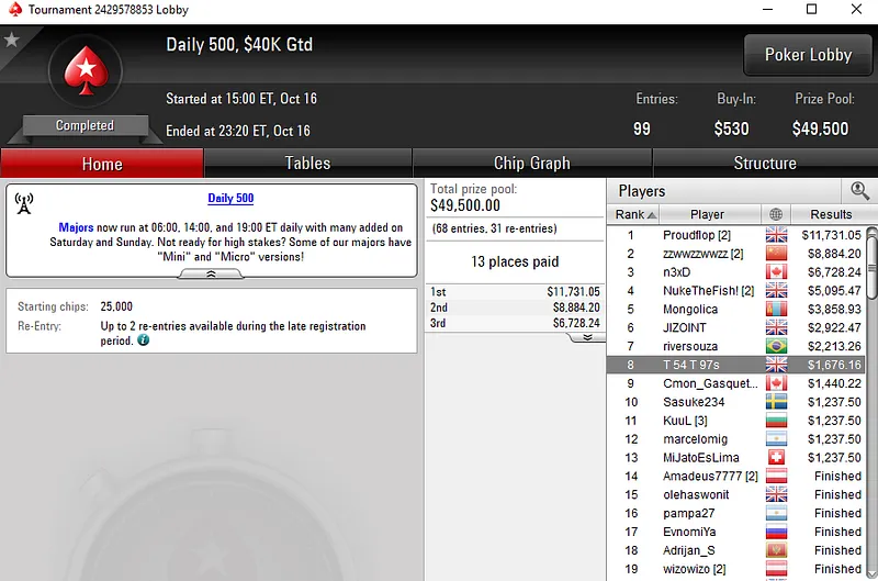Para terminar, fellatiado ainda chegou aos prémio no $1,050 Super Tuesday com 187 jogadores. O prize pool de $187,000 foi repartido pelos 26 melhores classificados, com o luso a receber $3,396 na 12ª posição.