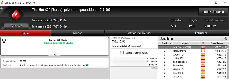 A vitória apareceu no Uppercut €20, com Kidfp a superar o field com 1,155 entradas para receber €2,234, entre prémio e bounties. O prize pool deste evento chegou aos €20,790.
