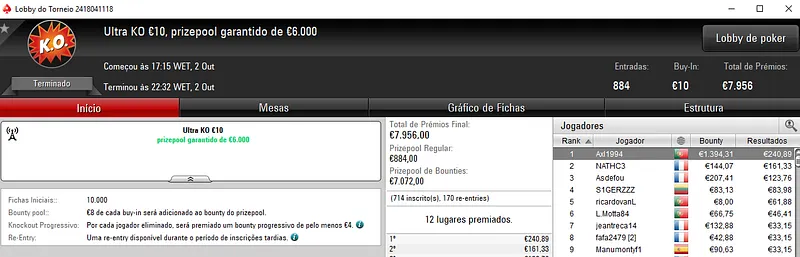 Assim, o único jogador que passou a fasquia dos dois mil euros foi artur_trofa que se sagrou campeão do Ultra KO €20 com 528 entradas. O torneio distribuiu €9,504 em prémios e bounties e o jogador luso arrecadou €2,074 pelo título.