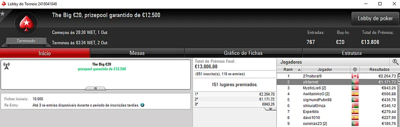 Os grandes vencedores do dia apareceram num torneio e domingo. O Sunday Special €100 apenas teve a sua conclusão ontem e Portugal colocou dois jogadores no pódio do torneio com 1,340 entradas. Faria73 perdeu o heads-up e embolsou €12,037 de recompensa, enquanto CrushMeDonK terminou em terceiro e recebeu €8,319 pela medalha de bronze. Este evento contou com um prize pool de €125,000, onde 269 jogadores saíram com prémio. Na quinta posição, SnapOut0f_it ainda arrecadou €3,973.