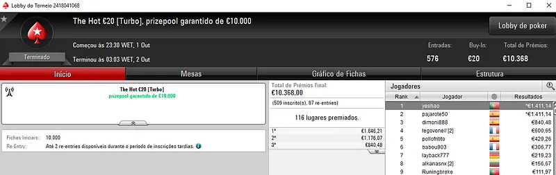 Já nos torneios de segunda o destaque vai para a vitória de marciolola nas mesas do Eliminator €200 com 92 jogadores. Aqui, o prize pool chegou aos €15,500, com o jogador luso a faturar €5,206, entre prémio e bounties.