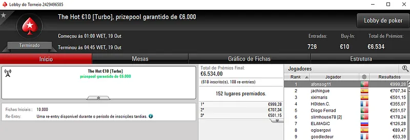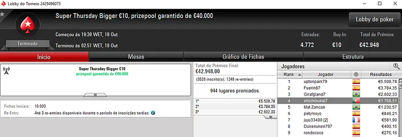 Apesar do grande número de prémios na ordem dos quatro dígitos, houve apenas um que se destacou e chegou aos 3 mil euros. Kuatro terminou o Super Thursday Hot BigStack Turbo €50 com 678 entradas na segunda posição e arrecadou €3,308 de prémio. O prize pool deste evento chegou aos €30,510 e foi distribuído pelos 678 melhores classificados. Na quarta posição, atarracho saiu com €1,659 de prémio. Na posição seguinte, 60NoPau encaixou €1,175.