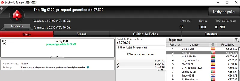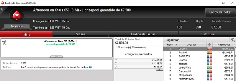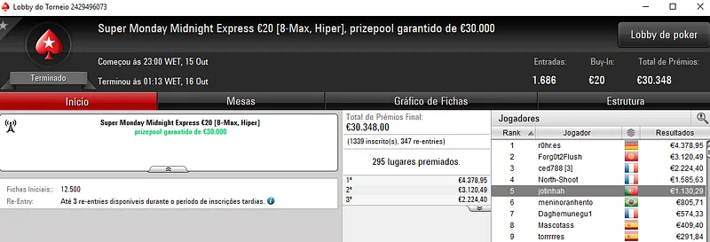 Já o Super Monday Hot BigStack Turbo €50 contou com quatro jogadores no top 5 do torneio. O melhor lugar pertenceu a ruiatg que saiu com €3,177 na segunda posição. O torneio acolheu 633 entradas e o prize pool foi de €28,485. AAEUKK foi terceiro classificado para €2,252. Na quarta posição, atarracho faturou €1,597, enquanto bakerpt ainda recebeu €1,132 em quinto.
