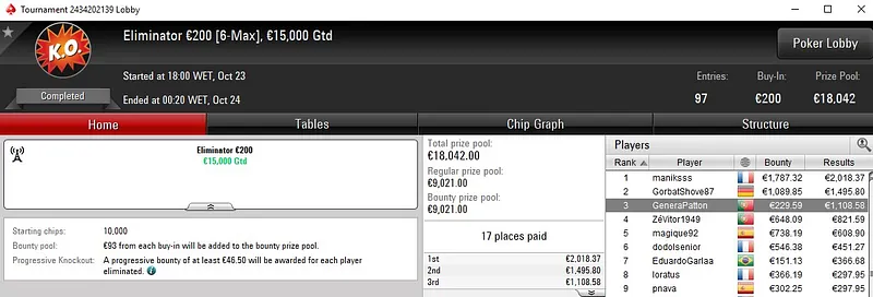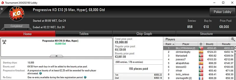 No Progressive KO €50, pikko86 bateu toda a concorrência e levou a maior fatia de um prémio total de €12.500. O português foi o melhor entre um field de 262 entradas, garantiu a medalha de ouro e um prémio de €2.475.