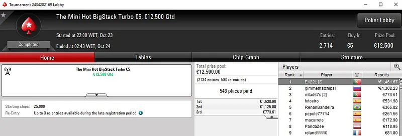 Quem também teve uma boa performance nesta terça foi moinha82, que terminou na 3ª posição do High Roller €250 para aumentar a banca em €2.716. O torneio contou com 92 entradas e um total de €21.390 em prémios. No 5º posto ficou Squeezamos com direito a €1.541.