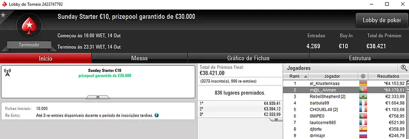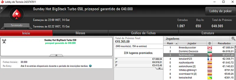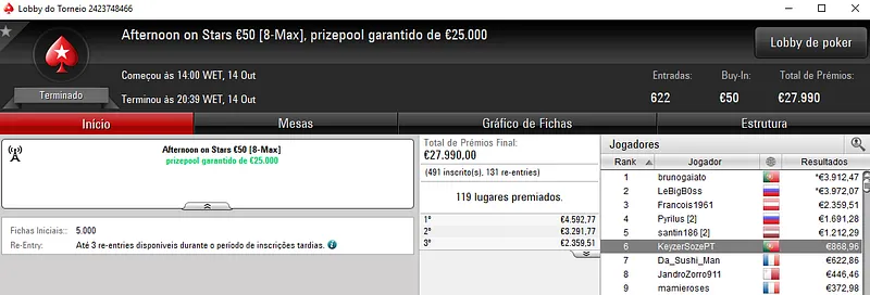 O grande resultado do dia pertence a ZéVitor1949 que embolsou €12,159 após a vitória do Sunday High Roller €250 com 291 jogadores. O jogador luso levou o maior prémio dos €67,657 de prize pool, onde MysticLie6 foi nono classificados para €1,200.