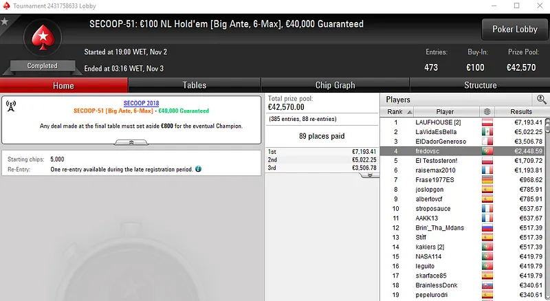 Também na quarta posição, KKmatamoscas faturou €5,019 de prémio no SECOOP # 42 NLHE 6th Sense, onde foram registadas 2,453 entradas. Este torneio acabou por repartir o prize pool acumulado de €110,385 pelos 431 melhores classificados. El Flatador foi sétimo e recebeu €1,632 de recompensa.