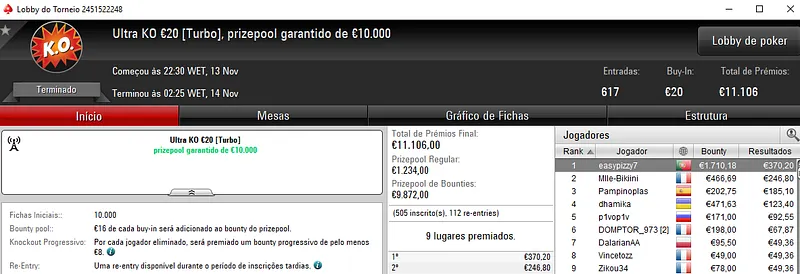 KKmatamoscas foi o campeão do Eliminator €200 com 110 jogadores. O jogador luso embolsou €4,294 e viu mais 18 jogadores dividirem o prize pool de €20,460 acumulado.