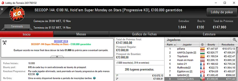 O maior vencedor foi NASA114 que terminou o Night on Stars €100 na segunda posição. O torneio acolheu 390 entradas e o prize pool de €35,100 foi distribuído pelos 71 melhores classificados. O jogador luso teve direito a €4,480 junto com a medalha de prata. Na quinta posição, teerrorista saiu com €1,809.