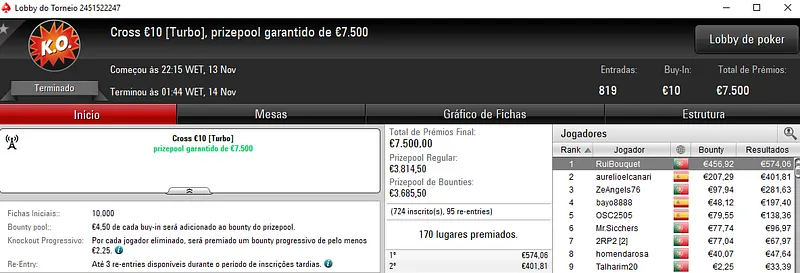 Já xaneta7 terminou o High Roller €250 na terceira posição e arrecadou €3,294 de prémio. Este evento viu 117 jogadores no field que perfizeram um prize pool de €27,202, onde 20 jogadores saíram premiados. Na quarta posição, batrax ainda faturou €1,867.