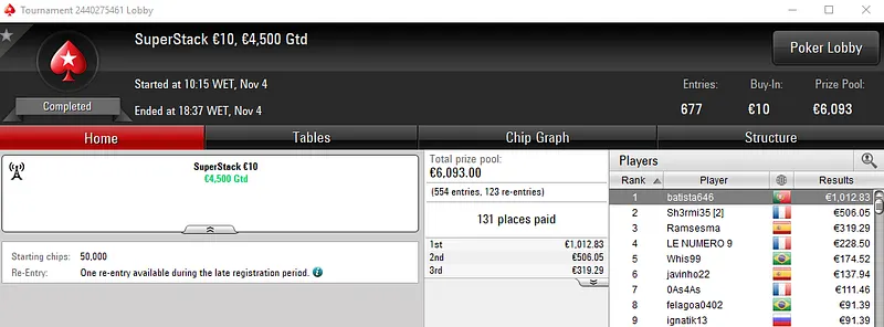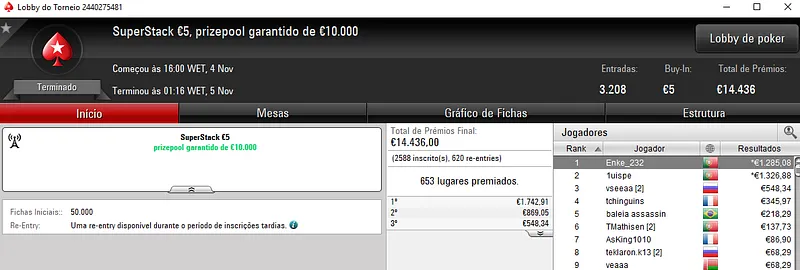 O único resultado que ultrapassou a fasquia dos três mil euros foi conseguido por nazgra no Afternoon on Stars €50 com 638 entradas. O jogador nacional terminou o evento na segunda posição e levou para casa €3,376 de prémio. Este torneio repartiu €28,710 pelos 119 melhores classificados.