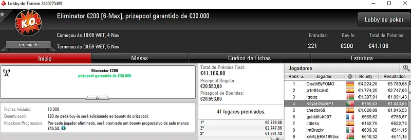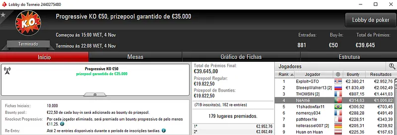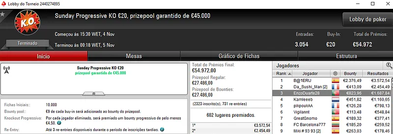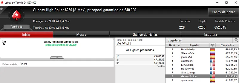 Já allenNN.KP chegou aos €2,979 de prémio com a medalha de prata no Sunday Starter €100 com 4,012 entradas. O jogador luso assegurou este prémio depois de realizar acordo no 3-handed. Este torneio contou com €36,108 de prize pool e no total, 800 jogadores saíram com prémio.