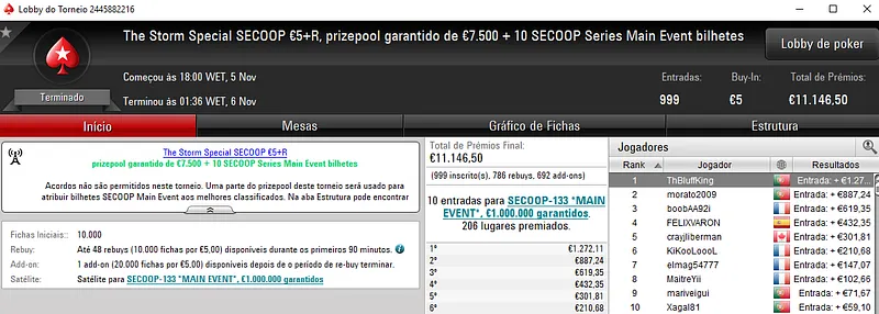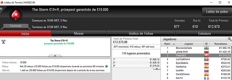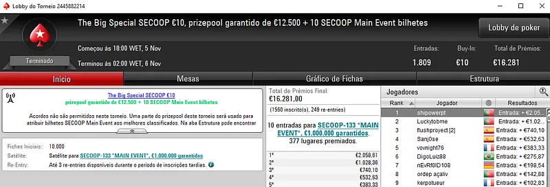 Já no High Roller €250, wannab333 levou para casa a medalha de prata e cerca de €3,331 de prémio. Participaram neste evento 83 jogadores, onde 15 repartiram o prize pool de €19,297. Com a terceira posição, moinha82 faturou €2,513.