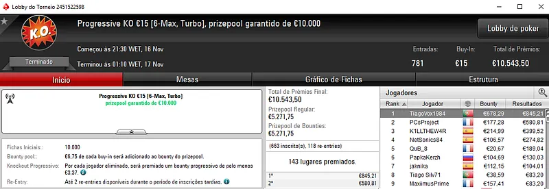 Já o triunfo de fredbiel no The Hot €50 valeu €1,697 de recompensa. Com 200 entradas, este torneio distribuiu €9,000 pelos 35 melhores classificados.