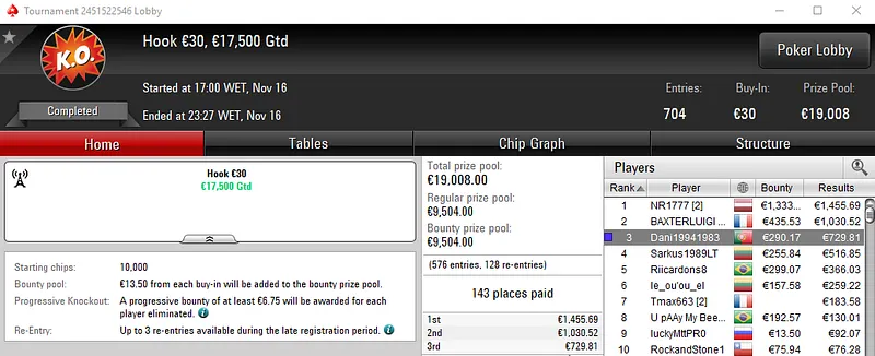 O grande vencedor foi dealerzon que levou para a sua conta €1,848 após vitória no Zoom Progressive KO €30. Este evento acolheu 318 jogadores, onde o prize pool distribuído chegou aos €8,586.