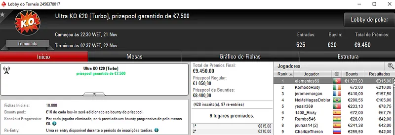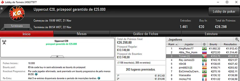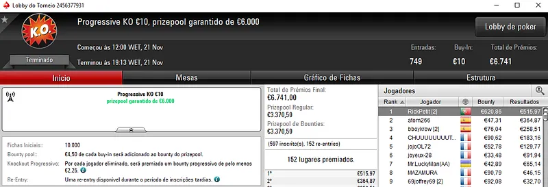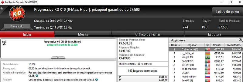 Já no Midnight Express €20, ordep açaliv saiu com a medalha de prata e €2,377 de prémio na conta. Aqui foram registadas 1,236 entradas que perfizeram um prize pool acumulado de €22,500. No fim, 231 acabaram por repartir o prize pool e sair com prémio deste torneio.