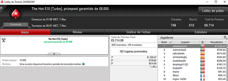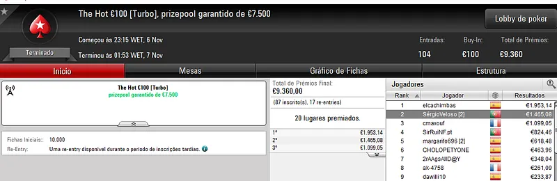 O mesmo SirRuiNF.pt também ultrapassou a fasquia dos dois mil euros ao vencer o 6-Max Club €20 com 387 entradas. Aqui, o prize pool de €6,966 foi distribuído pelos 77 melhores classificados, com o jogador luso a amealhar mais €1,239, para um total de €2,703 na sessão.