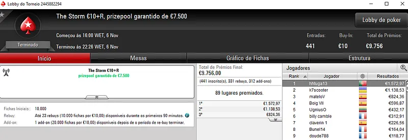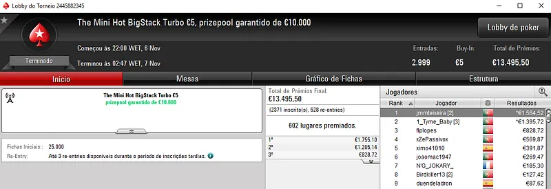 Dois jogadores conseguiram esse objetivo. HanzoooKid levou o maior prémio individual do dia ao terminar o High Roller €250 na terceira posição. Este evento acolheu 85 jogadores e o português faturou €2,573 de prémio. Com um prize pool de €19,762, 15 jogadores arrecadaram prémio, com SirRuiNF.pt a encaixar €1,464 de recompensa.