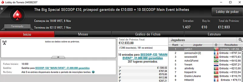 As mesas dos torneios regulares de ontem da PokerStars.FRESPT também forma bem concorridas e forma vários os jogadores nacionais que atingiram os quatro dígitos. Mais difícil de encontrar foi jogadores que ultrapassassem a barreira dos dois mil euros em prémios.