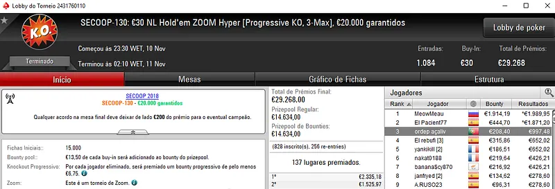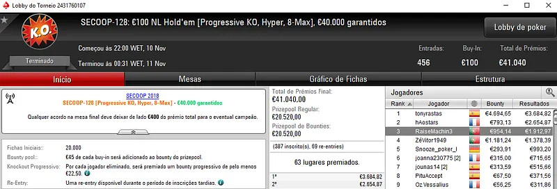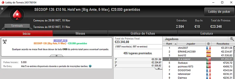 O grande vencedor da noite foi rola33 que se sagrou campeão do SECOOP #124: €100 NLHE com 582 entradas. O jogador luso embolsou €8,772 de prémio pelo título no torneio que distribuiu €52,380 pelos 107 melhores classificados. Neste mesmo evento, kakiers saiu na terceira posição para receber €4,622 de recompensa. Em sétimo, GANDI[FCP] embolsou €1,283 de prémio.