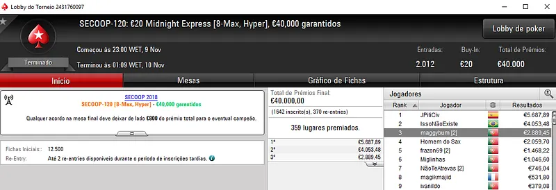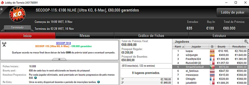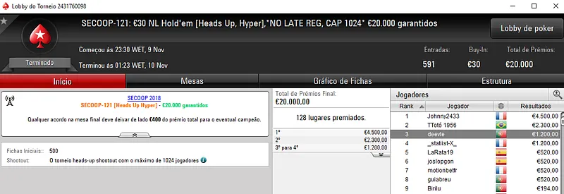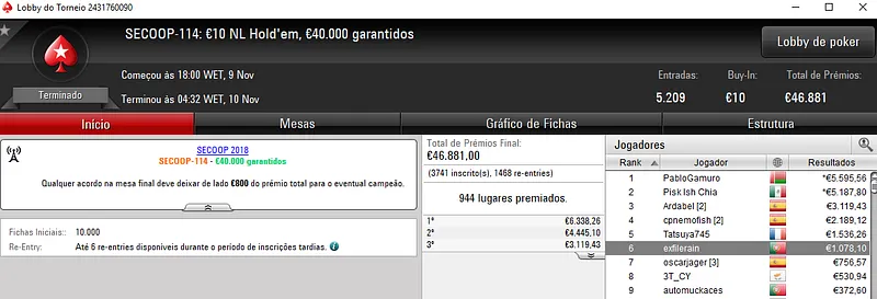 Já NASA114 ficou muito perto do título no SECOOP #106: €250 NLHE Super Thursday com 621 entradas. Aqui, o prize pool de €150,000 foi repartido pelos 119 melhores classificados, onde o jogador luso encaixou €13,626, entre prémio e bounties. Com o nono posto, Peixinho2016 ainda levou para a sua conta €3,058.
