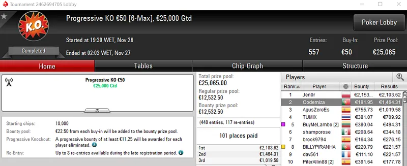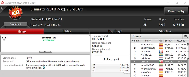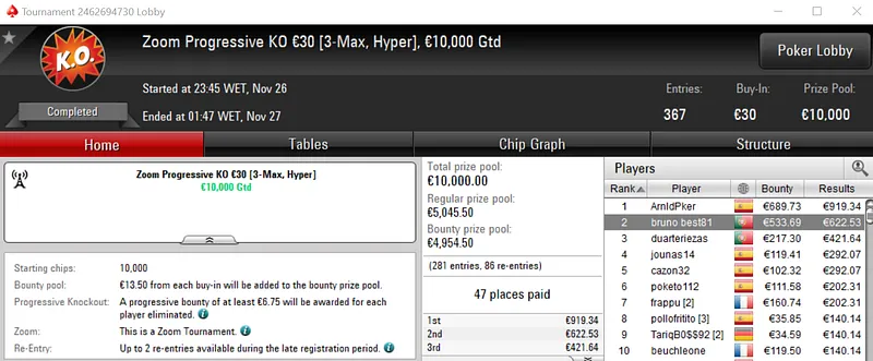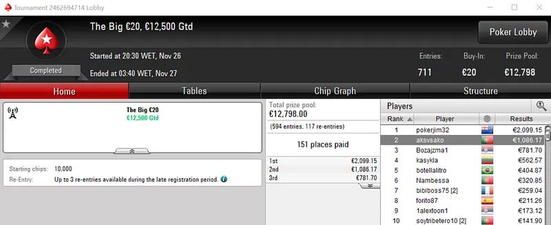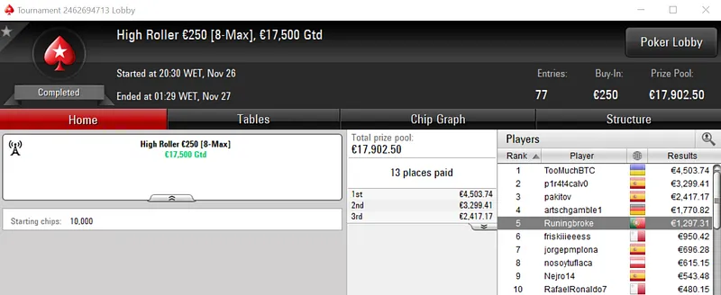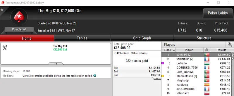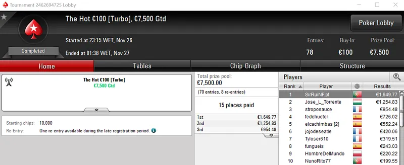 Já no Hook €30 houve mesmo vitória lusitana, com slimhouse78 a embolsar €3,612, entre prémio e bounties. Este evento acolheu 866 entradas e o prize pool acumulado chegou aos €23,382.