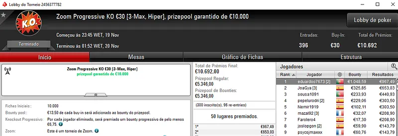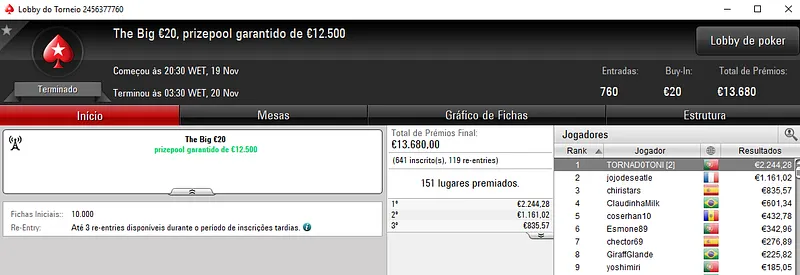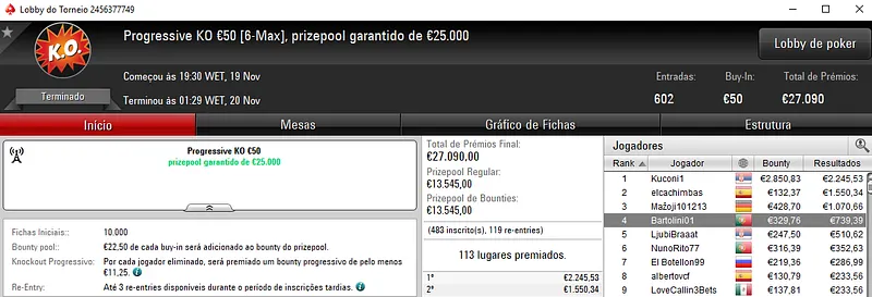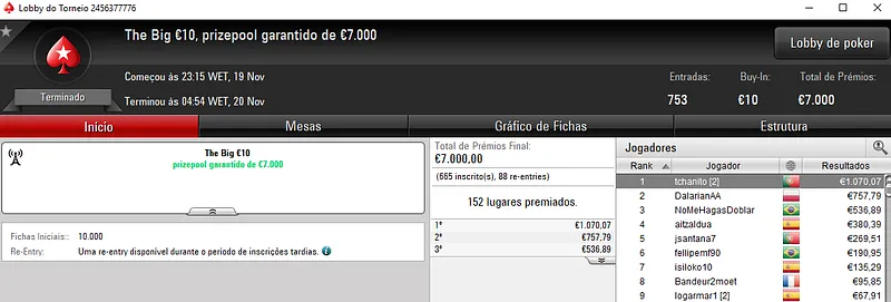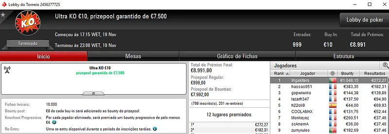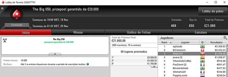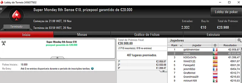 Já no Super Monday Bigger €10 com 3,912 entradas houve "dobradinha" lusa com os dois melhores lugares do pódio a vestirem as cores nacionais. Com o primeiro lugar, lightglitch encaixou €4,534 de prémio, enquanto Sambu1998 saiu com €3,115 em segundo. O prize pool deste evento chegou aos €35,208, com 764 jogadores a repartirem os prémios. Onde na quinta posição, Genskunk69 ainda arrecadou €1,013.