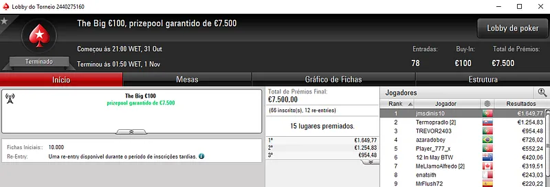 Já no Night on Stars €100, quatro jogadores lusos terminaram no top 5 deste evento com 304 entradas. SirRuiNF.pt foi o melhor classificado e o segundo lugar deu direito a €3,615 de prémio. Na posição seguinte, jgrhajsj embolsou €2,658, enquanto LeChatNoir4 recebeu €1,955 na quarta posição. Com a quinta posição, xcizions ainda saiu com €1,437.