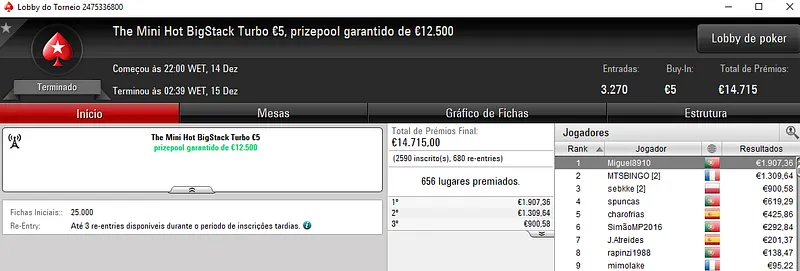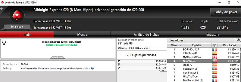 Com um prémio acima de três mil euros e outro acima de dois mil euros, foi assim que a sessão de poker online na PokerStars.FRESPT terminou para os jogadores lusos.