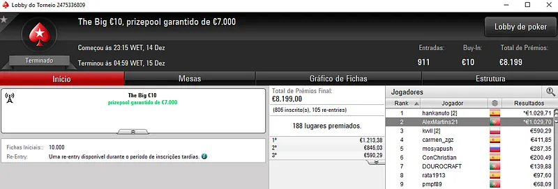 Já a medalha de prata no High Roller €250 valeu €2,621 na conta de TREVOR2403. Com 53 entradas, este evento repartiu €12,500 pelos 9 melhores classificados.