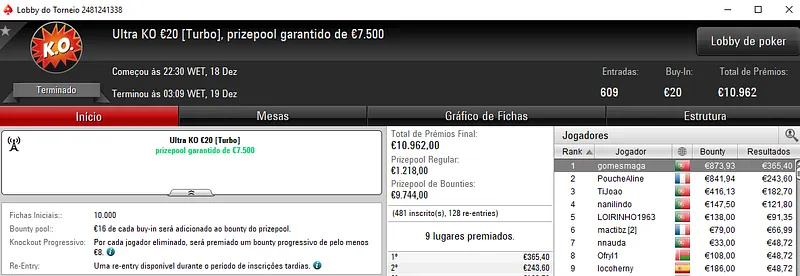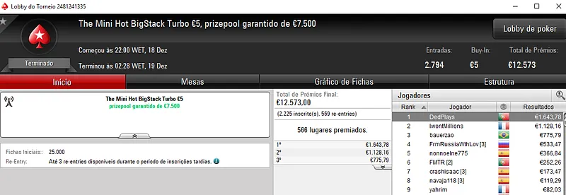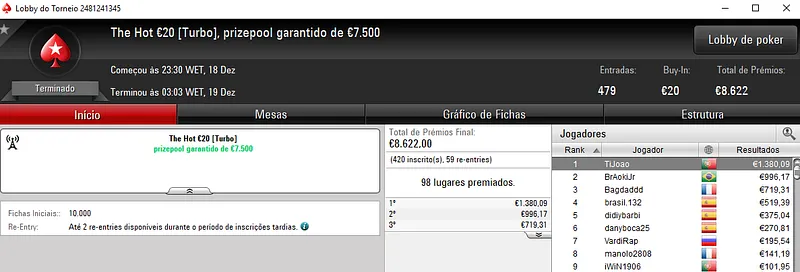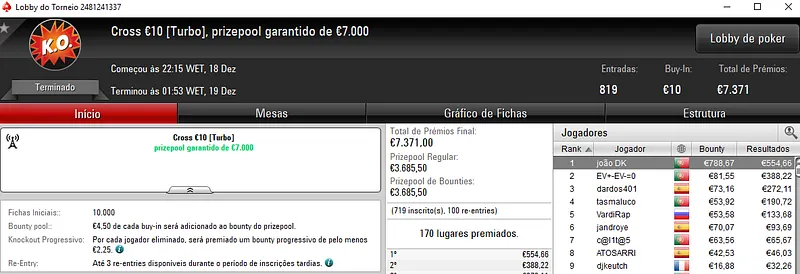 Já Tutti4Simons foi o campeão do The Big €50 com 456 entradas e €20,520 de prize pool. Para a sua conta voaram €3,308 de prémio, entre os 89 jogadores que dividiram o prize pool.