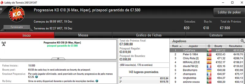 92Kelvin foi quem recebeu o maior prémio do dia ao se sagrar campeão do Progressive KO €50 com 544 entradas. O jogador luso embolsou €4,055, entre prémio e bounties neste torneio que distribuiu €24,480. Na terceira posição, MysticLie6 ainda levou para a sua conta €1,258 de prémio.