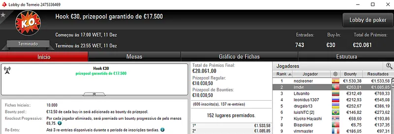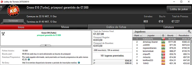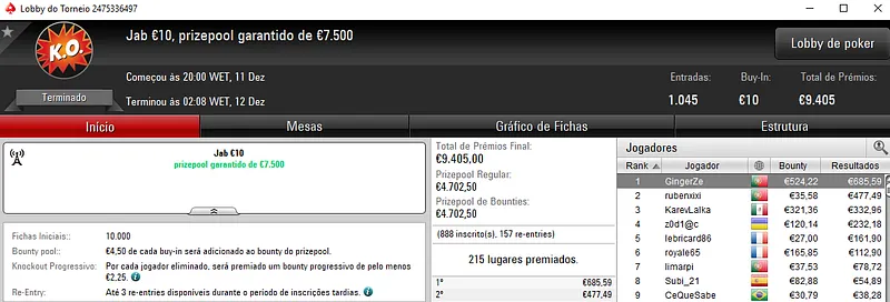 Com a vitória no Progressive KO €50, eazyomg10 embolsou €3,538 de prémio. O jogador luso superou o field com 474 entradas, onde foram distribuídos €21,330 de prize pool acumulado.