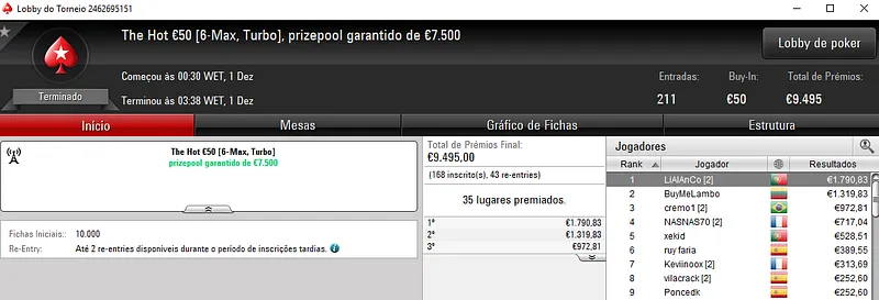 Já kakiers somou mais de quatro mil euros em dois torneios. O triunfo no The Hot BigStack Turbo €50 valeu €3,116 de prémio. Este torneio com 377 entradas viu o prize pool de €17,500 ser repartido pelos 79 melhores classificados. Depois de perder o heads-up, NunoRito77 teve direito a €1,738 de recompensa.