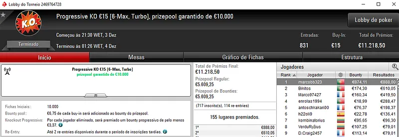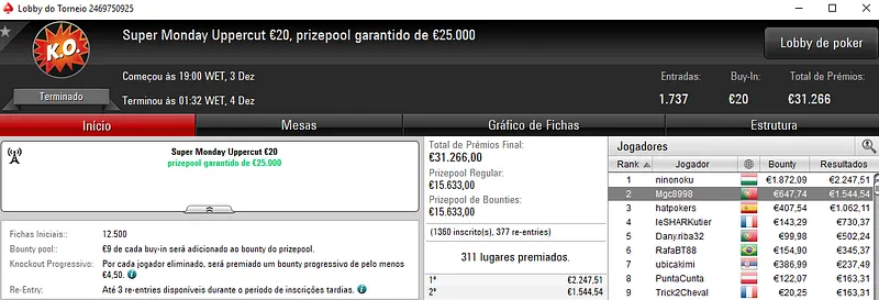 Já no Super Monday Hot BigStack Turbo €50 houve "dobradinha" nacional. O título ficou para TORNAD0TONI que levou para a sua conta €3,877, após superar o field com 541 entradas. Na segunda posição, GANDI[FCP] embolsou €2,795, dos €24,345 de prize pool acumulado.