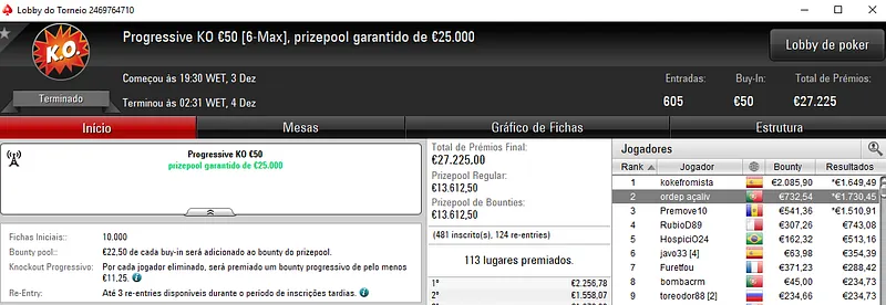Ontem foi dia de Super Monday na PokerStars.FRESPT, mas o maior resultado nacional apareceu num torneio de domingo. O Sunday Special €100 é jogado em dois dias e terminou apenas ontem. Com 1,311 entradas, o prize pool garantido de €125,000 foi repartido pelos 269 melhores classificados. Portugal contou com dois jogadores na mesa final, com friiss a levar €5,749 de prémio pelo quarto lugar. Na posição seguinte, TREVOR2403 teve direito a €3,973 de recompensa.