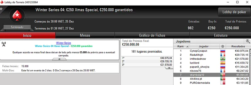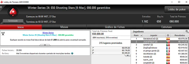 Também com o título saiu nicoji83 que venceu o Winter Series # 23: €30 NLHE ZOOM Hyper com 1,410 entradas. O jogador português embolsou €5,297 de prémio dos €40,000 distribuídos. Na terceira posição, duarteriezas ainda arrecadou €1,767.