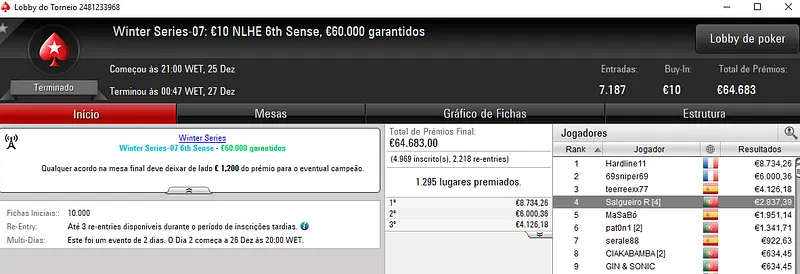 Com acordo no heads-up, linopolido sagrou-se campeão do Winter Series #12: €50 NLHE e embolsou €4,640 de prémio. Este evento contou com 658 entradas, onde o prize pool de €29,610 foi distribuído pelos 95 melhores classificados. Com a medalha de bronze, baptista136 teve direito a €2,594 de prémio.