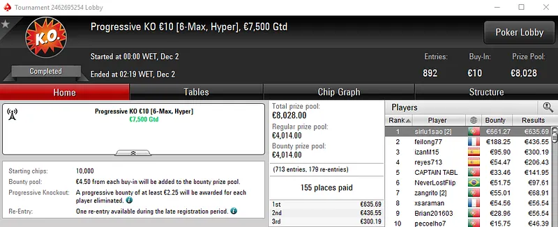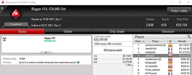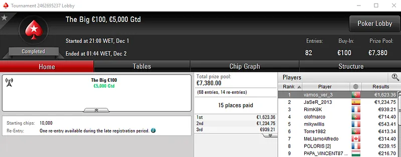 Já Fellini33 voltou a brilhar nas mesas ontem e amealhou dois bons resultados. Primeiro, foi campeão do The Big €100 com 110 entradas e €9,900 de prize pool. O ouro valeu €2,065 de prémio, onde km206 foi terceiro classificado para €1,162. No total, 20 jogadores receberam prémio neste evento.