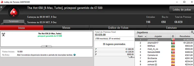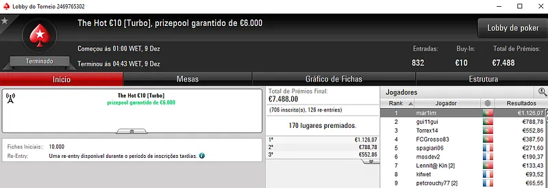 Foi o caso de ivanildo que foi segundo classificado no Night on Stars €100 com 249 entradas. O jogador luso encaixou €3,394 de prémio dos €25,000 de prize pool garantido, distribuídos pelos 47 melhores jogadores em prova.