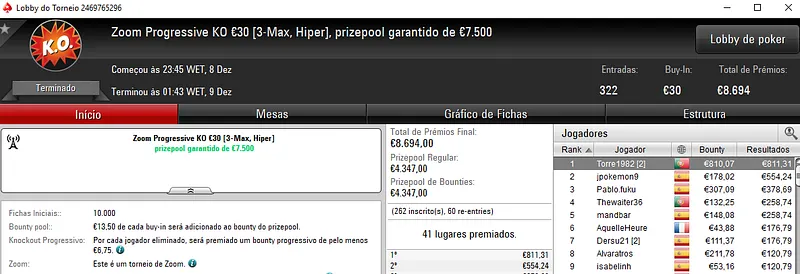 Também na segunda posição, nunocassamo levou para a sua conta €2,509 no High Roller €250 com 45 entradas. No terceiro posto, ZéVitor1949 teve direito a €1,807. Foram repartidos €12,500 pelos sete melhores classificados.