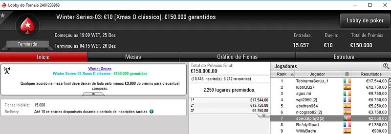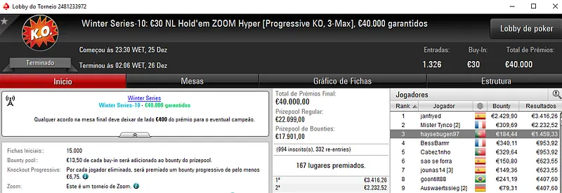 Ainda foram entregues mais dois prémios na ordem dos 4 dígitos. Na oitava posição, fredovsc embolsou €2,557, enquanto NOFEAR2500 recebeu €1,259 em 13º.