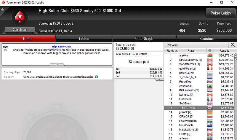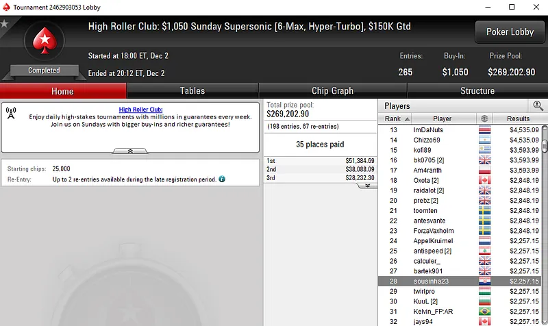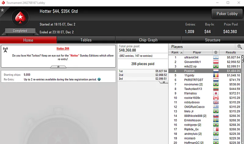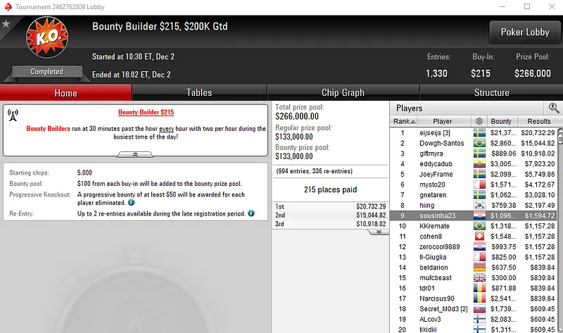 Pedro Marques foi terceiro classificado no Sunday High Roller Bounty Hunter com 249 entradas. Este torneio repartiu $253,980, com o português a receber $16,936, entre prémio e bounties.