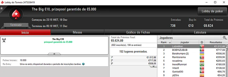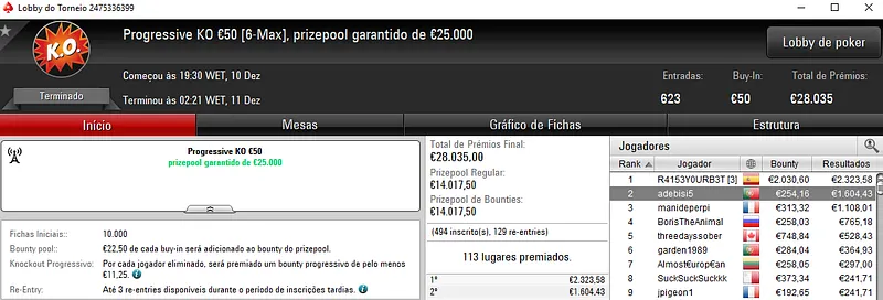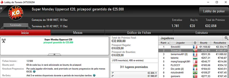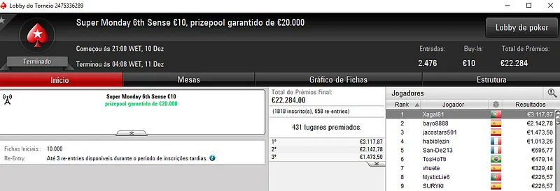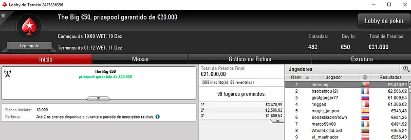 Outro grande resultado nacional apareceu com a vitória de dramboia10 no Super Monday Night on Stars €100 com 609 entradas. O torneio distribuiu €54,810 de prize pool acumulado com o jogador português a faturar €8,572, entre prémio e bounties. Na quinta posição, BILLYPIRANHA ainda levou para a sua conta €1,676.