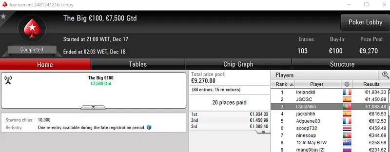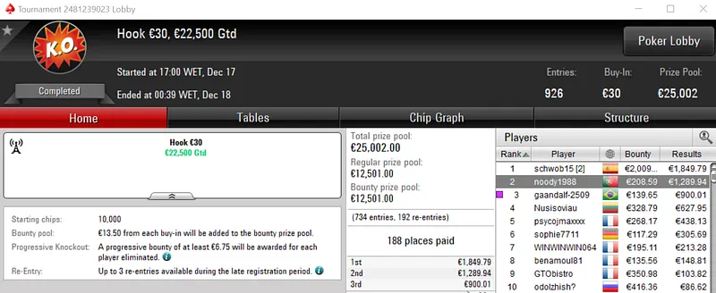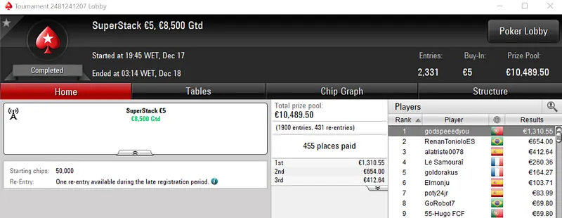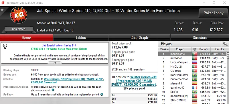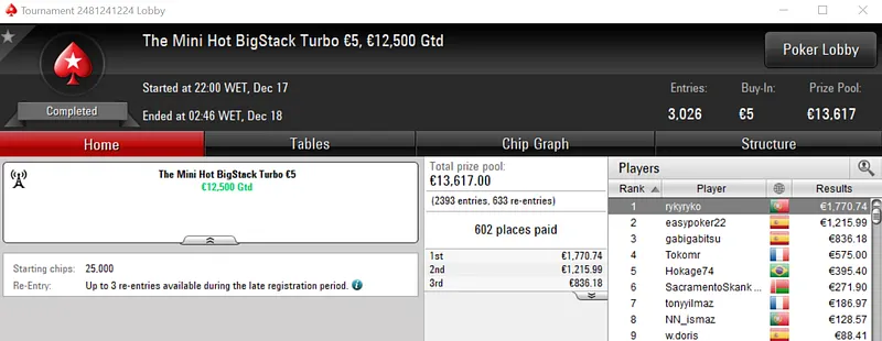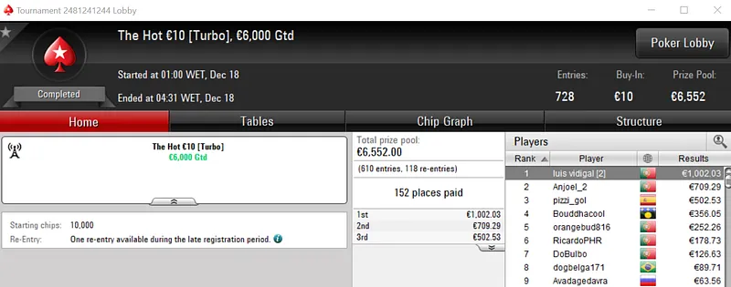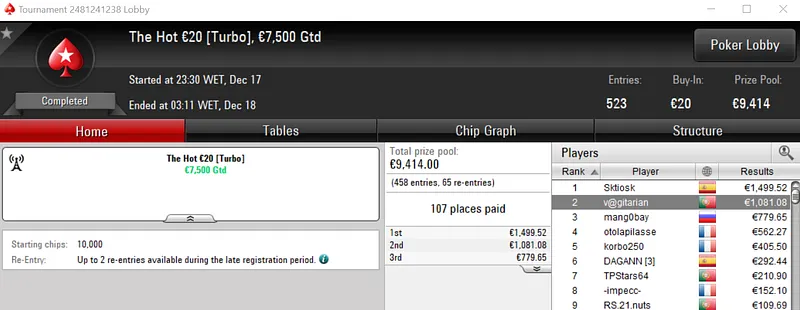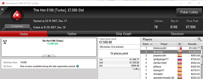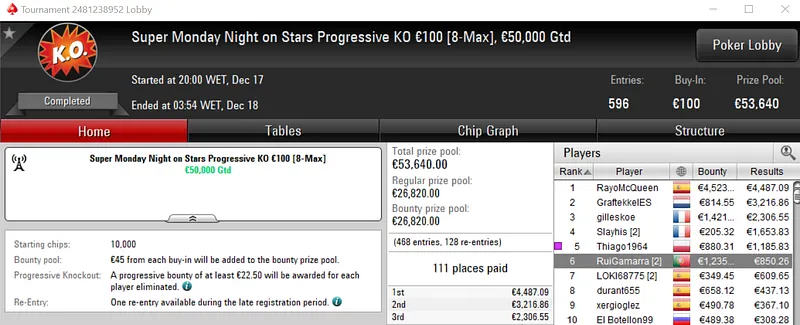 Com o prémio de €3,848, maggybum foi o grande vencedor do dia ao conquistar o Super Monday Hot BigStack Turbo €50. Este evento acolheu 537 entradas que se traduziram em €24,165 de prize pool, onde 107 jogadores saíram premiados.