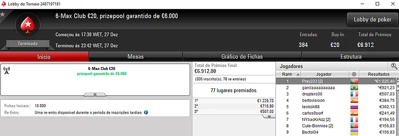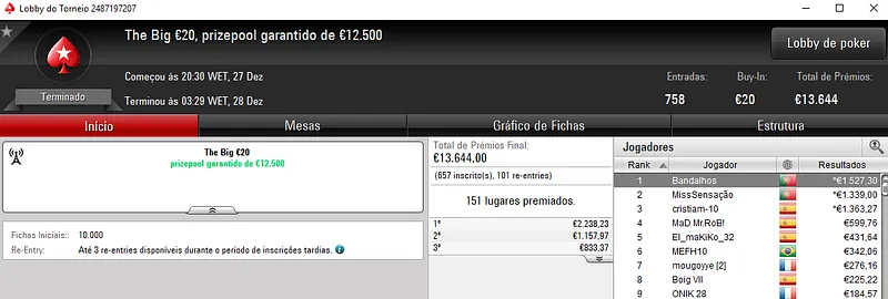 Já paulojorgeal venceu o The Big Special Winter Series €10 com 1,924 entradas e €17,316 de prize pool. Para a conta do jogador luso voaram €2,212 de prémio e ainda bilhete de €250 para as Winter Series.