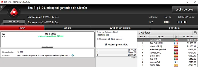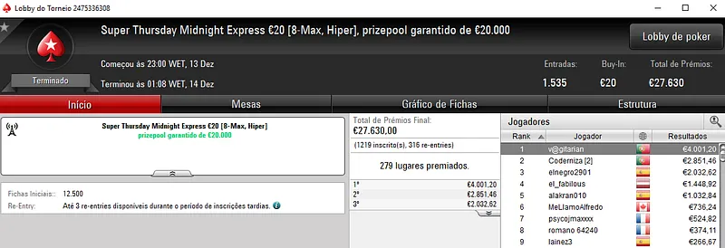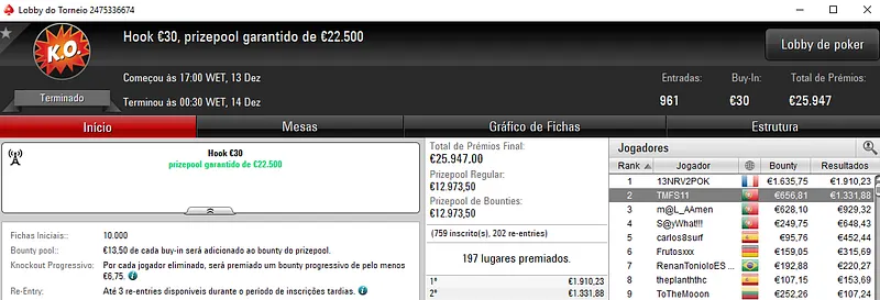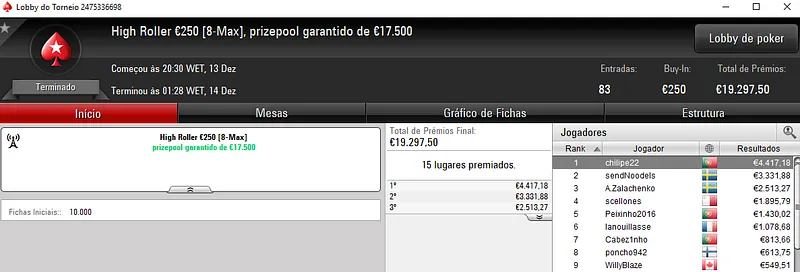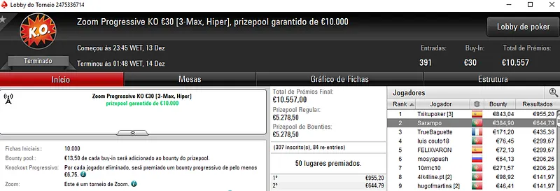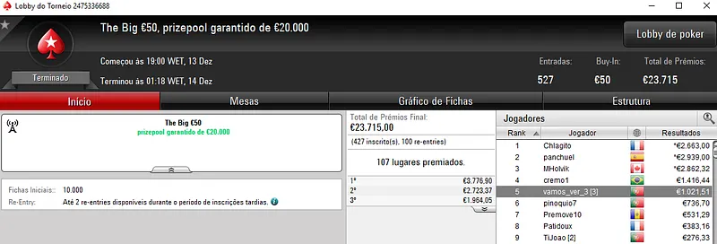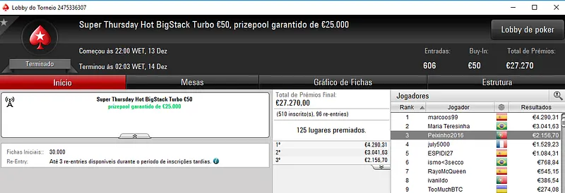 Já Tutti4Simons dividiu o prémio no heads-up do Super Thursday Bigger €10 com 4,627 entradas. O jogador luso embolsou €4,508 de prémio dos €41,643 distribuídos pelos 908 melhores classificados.