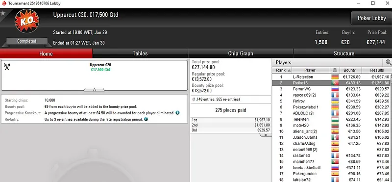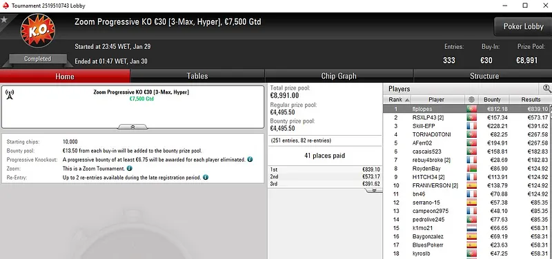 Meia hora depois, Peixinho2016 foi buscar mais um prémio de quatro dígitos no Progressive KO €50 [6-Max]. Foi 2º classificado entre um field de 571 entradas e somou mais €2.030 (bounties incluídos) à sua banca.
