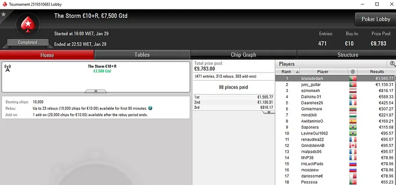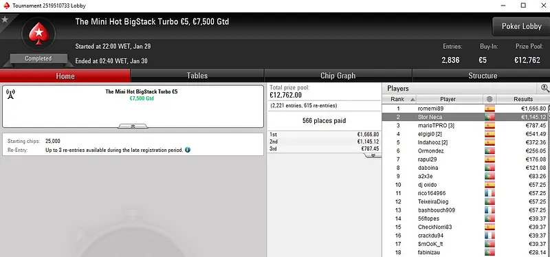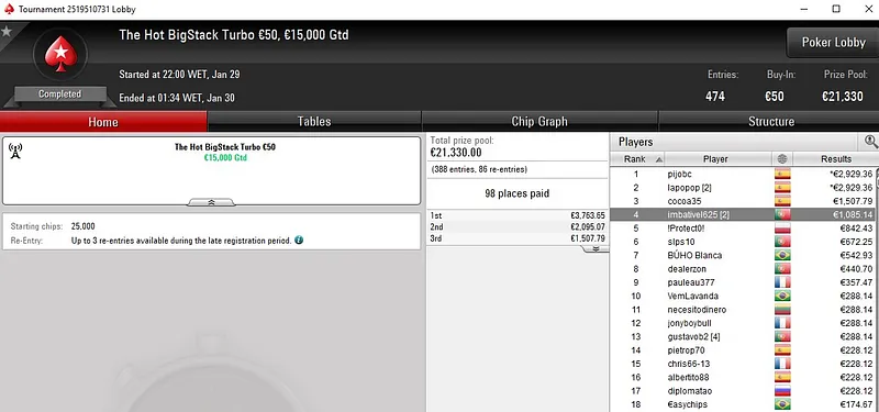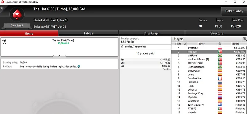 Quem também brilhou na sessão de ontem foi Peixinho2016, com duas medalhas de prata e mais de €4.300 em prémios. No The Big €50, torneio que registou 438 entradas e quase €20K em prémios, o luso subiu ao segundo lugar do pódio para receber €2.300.