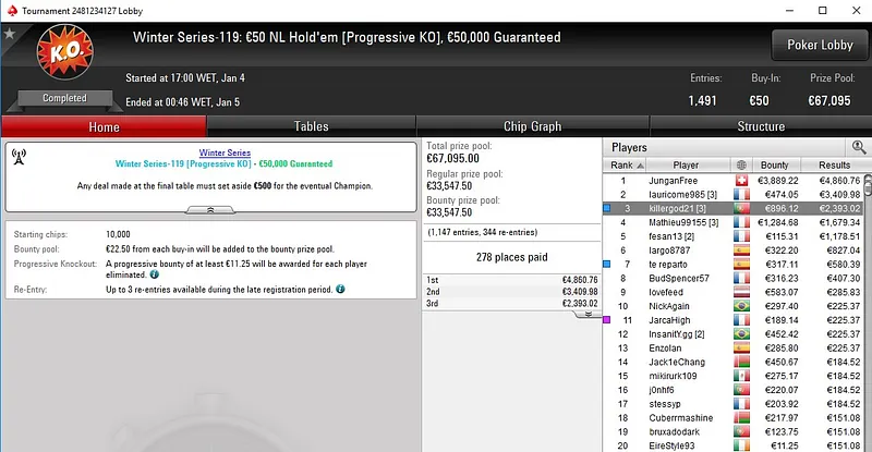 | 132 | 17:00 | 50 € | Normal | Sim | 6-Max PKO | 50,000 € |